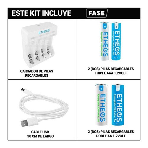 Este producto es perfecto para quienes buscan reducir el consumo de pilas desechables y contribuir al cuidado del medio ambiente. Ideal para dispositivos que requieren pilas, como controles remotos, juguetes y dispositivos electrónicos portátiles. Con el cargador Etheos, disfrutarás de una experiencia de carga eficiente y sostenible.