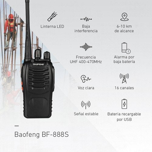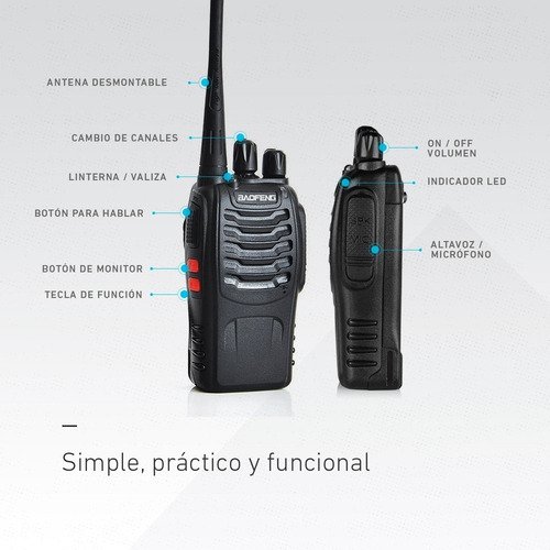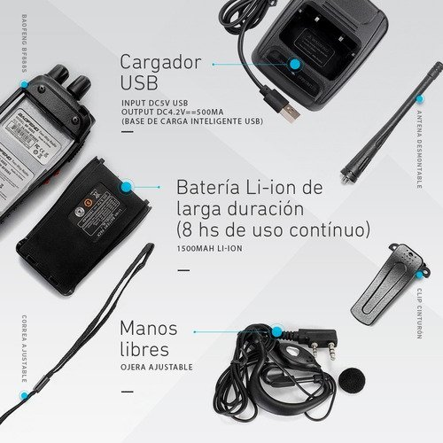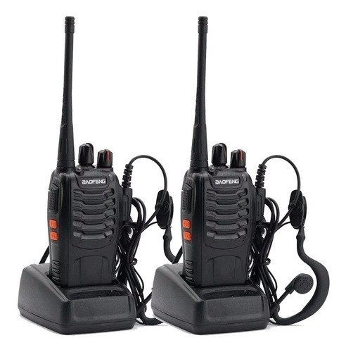 El kit incluye dos Handy Baofeng Radio Walkie Talkie Bf888s 16ch UHF en color negro, con auriculares manos libres y base de carga USB. Este equipo es ideal para diversas actividades como caza, pesca, montañismo, vigilancia del medio ambiente, comunicación entre dos casas o entre vehículos, seguridad, almacenes, construcción, espionaje, aire libre, paint ball, airsoft, náutica, deportes y muchas otras situaciones.