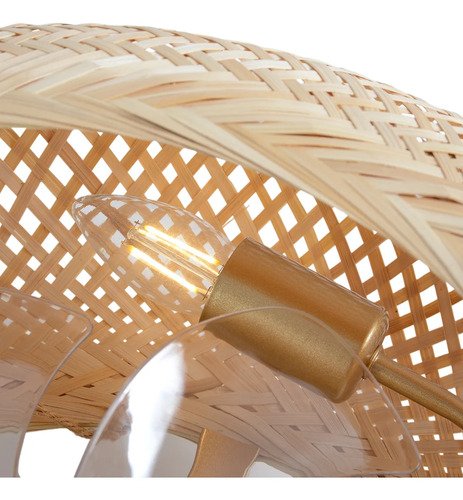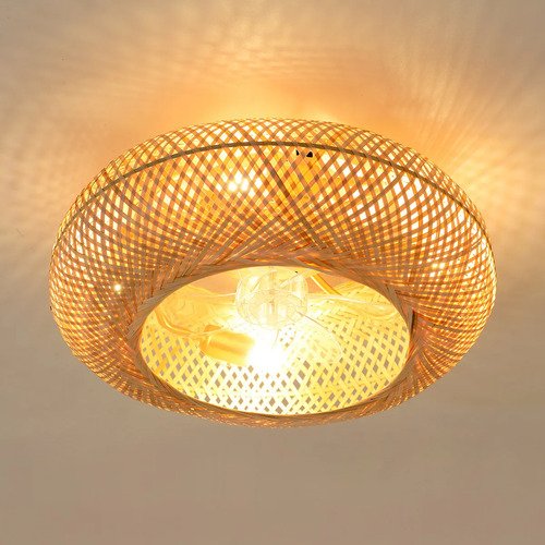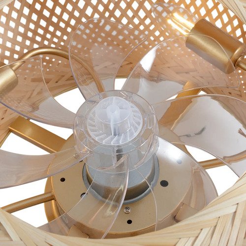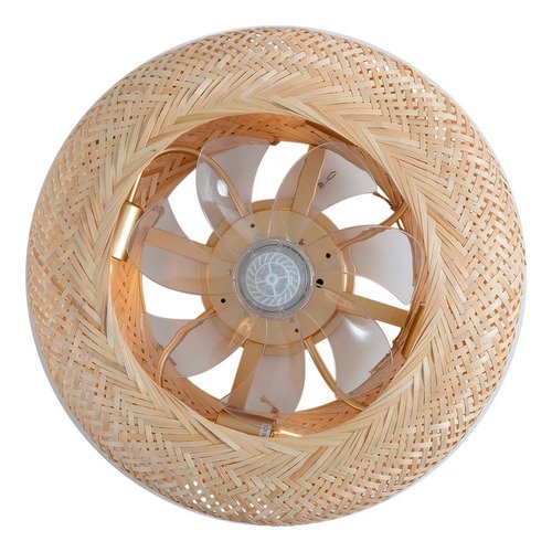 Transforma tu espacio con esta luminaria única que combina estilo natural y funcionalidad avanzada. Su estructura de metal y bambú tejido aporta calidez y distinción, mientras que sus siete aspas de acrílico transparente aseguran un rendimiento óptimo y silencioso.
