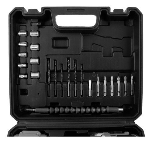 Incluye un maletín de transporte que contiene dos baterías de 1.5 Ah, un cargador y una variedad de accesorios, como 9 boquillas y mechas para diferentes materiales. La función de percutor y el control de torque de hasta 45 Nm aseguran un rendimiento óptimo en diversas aplicaciones. Además, cuenta con un indicador de carga de batería y un botón de bloqueo para mayor seguridad y comodidad.