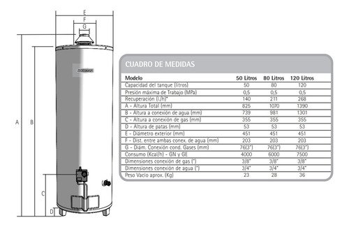 Con un consumo de 4000 kcal/h, este modelo proporciona una recuperación de 150 litros por hora con gas natural y 146 litros por hora con GLP, asegurando que siempre tenga agua caliente disponible. La válvula de seguridad y el sistema de protección anti-corrosiva añaden una capa adicional de confianza en su funcionamiento.