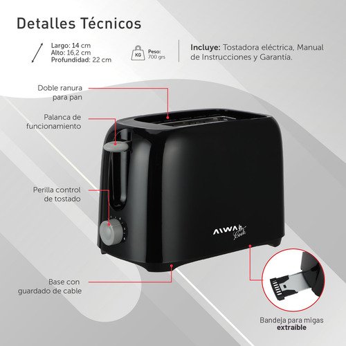 El modelo AWK-TO700N de Aiwa es perfecto para familias o para quienes disfrutan de un desayuno rápido antes de salir. Su diseño práctico y funcional, junto con su capacidad de tostado, la convierten en una herramienta indispensable en la cocina. Experimenta la comodidad y el sabor de un buen tostado con esta tostadora eléctrica de alta calidad.