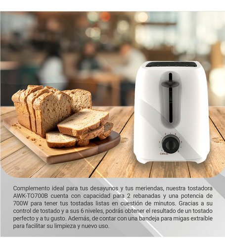 El complemento ideal para tus desayunos y tus meriendas, nuestra tostadora AWK-TO700B cuenta con capacidad para 2 rebanadas y una potencia de 700W para tener tus tostadas listas en cuestión de minutos. Gracias a su control de tostado y a sus 6 niveles podrás obtener el resultado de un tostado perfecto a tu gusto. Además, de contar con una bandeja para migas extraíble para facilitar su limpieza y nuevo uso.